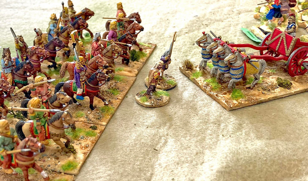 Cyrus had one chariot model (to Artaxerxes’ five). He sent it against Artaxerxes massed cavalry. It tore through the supporting takabara (peltasts) and then through the cavalry before crashing behind them. Artaxerxes had been hoping to advance quickly on his right flank with his superior numbers of cavalry to take out Cyrus’ bodyguards but the chariot forced him to slow his advance to redress ranks before pushing on.