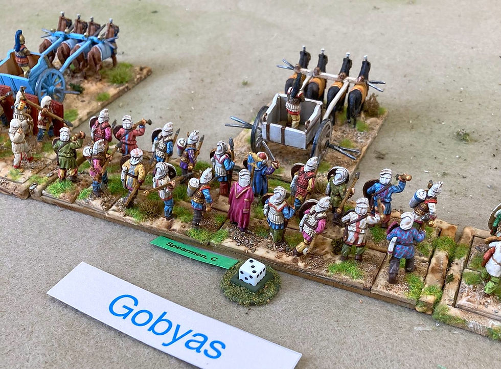 Artaxerxes troops deployed with chariots in front of Gobyas’ infantry.