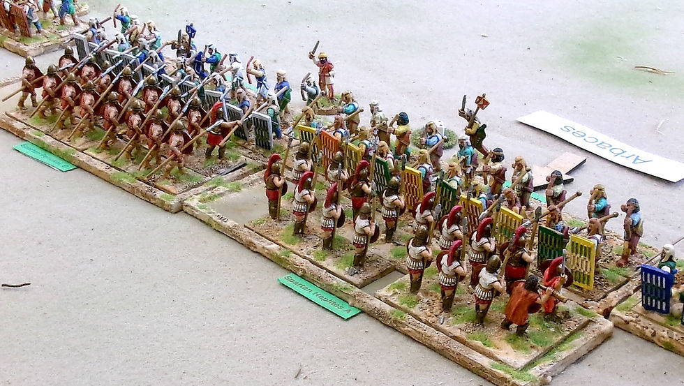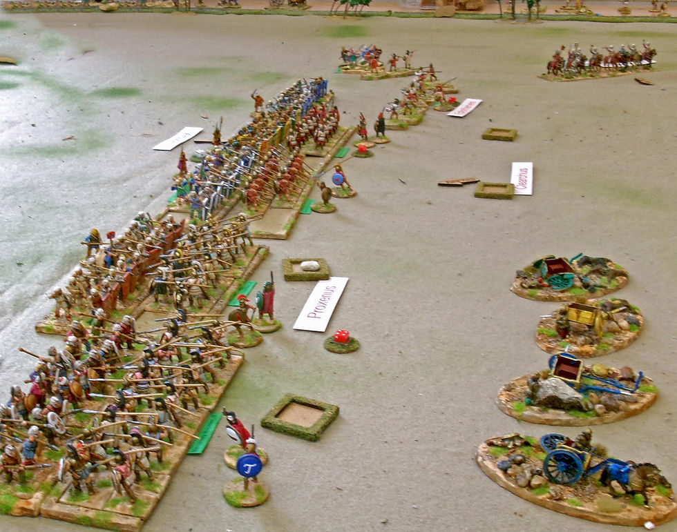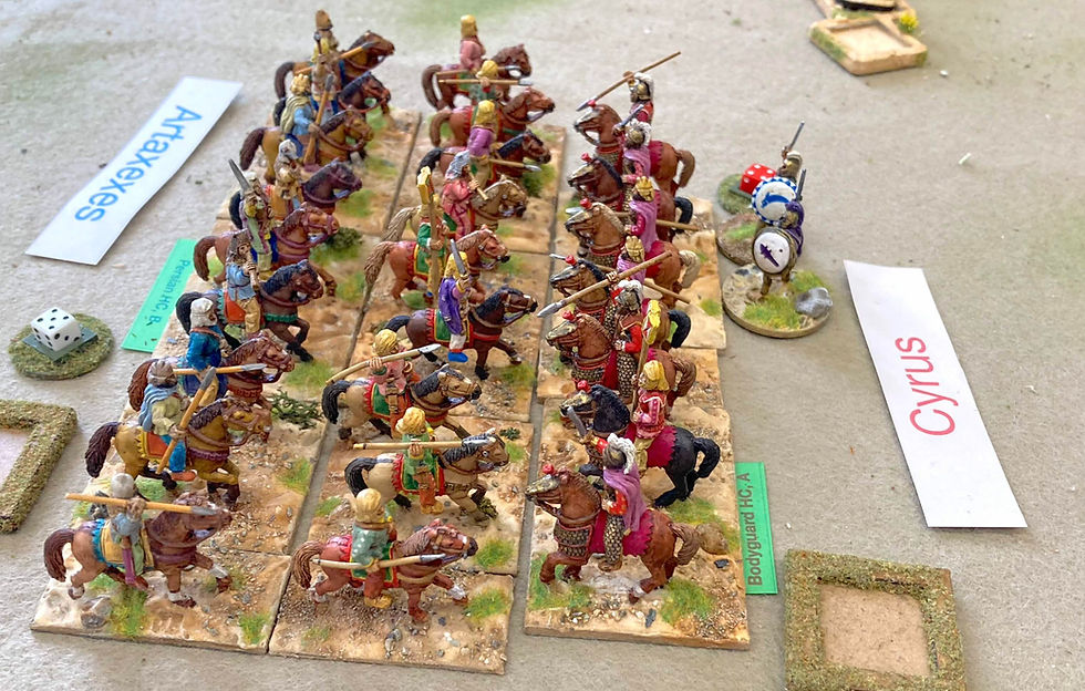 In the centre Clearchus’ Greeks advanced against Arbaces’ Persians, taking fairly significant casualties from archery as they did. Clearchus was wounded in the arrow storm and when the lines clashed he was killed. This was down to the fates intervening or perhaps because Clearchus used Ernie Fosker’s dice to determine the outcome — never a good plan!