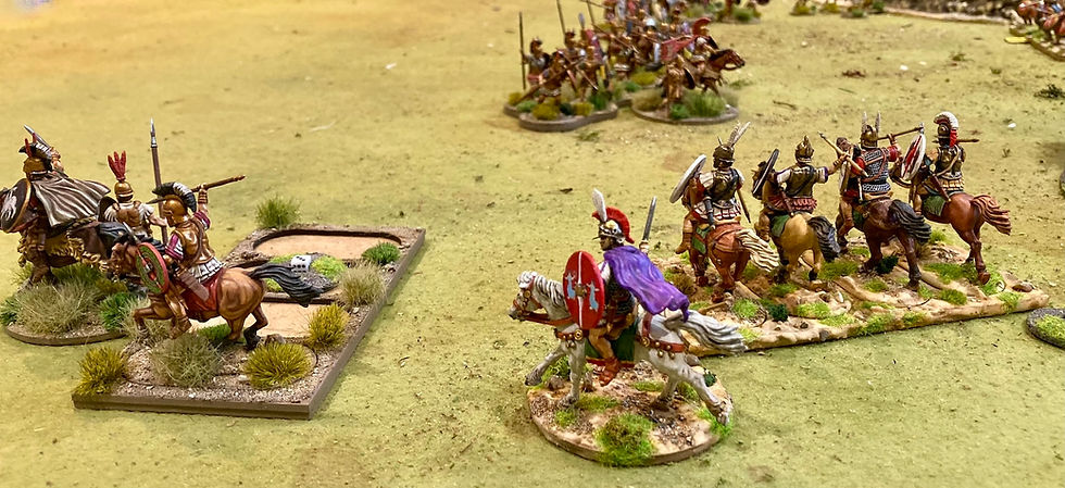To protect the Etruscan left, the gallant Velthur Macstarna, leads forward the dashing young aristocratic cavalry of Tarquinia to counter Roman cavalry advancing on that flank.