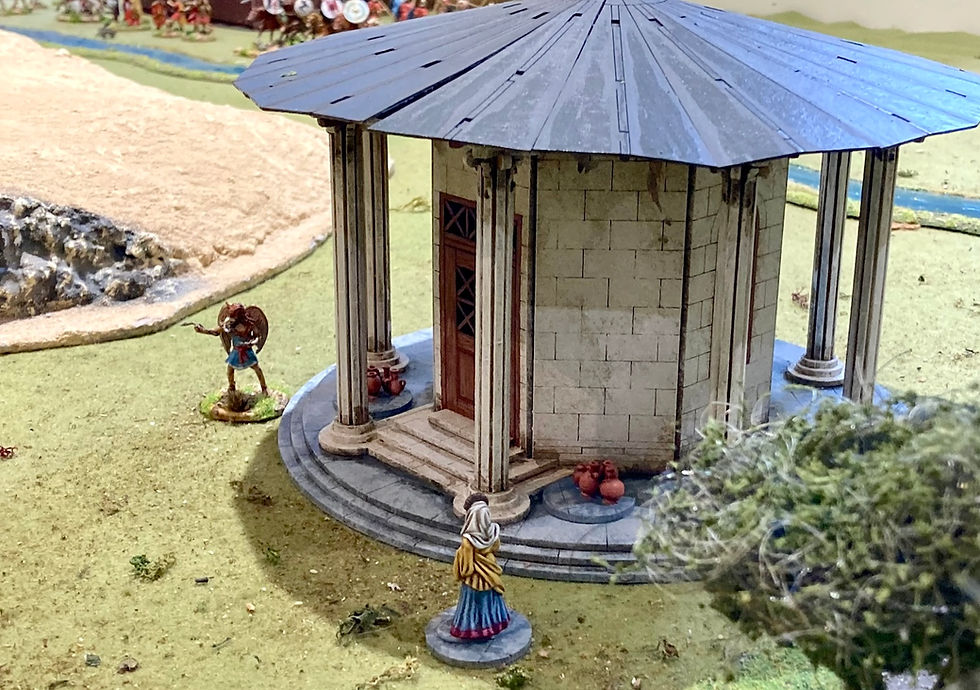 In the centre, Prince Larth’s Etruscan Hoplites have formed ‘phalanx’ to meet the Roman advance and to defend the temple.