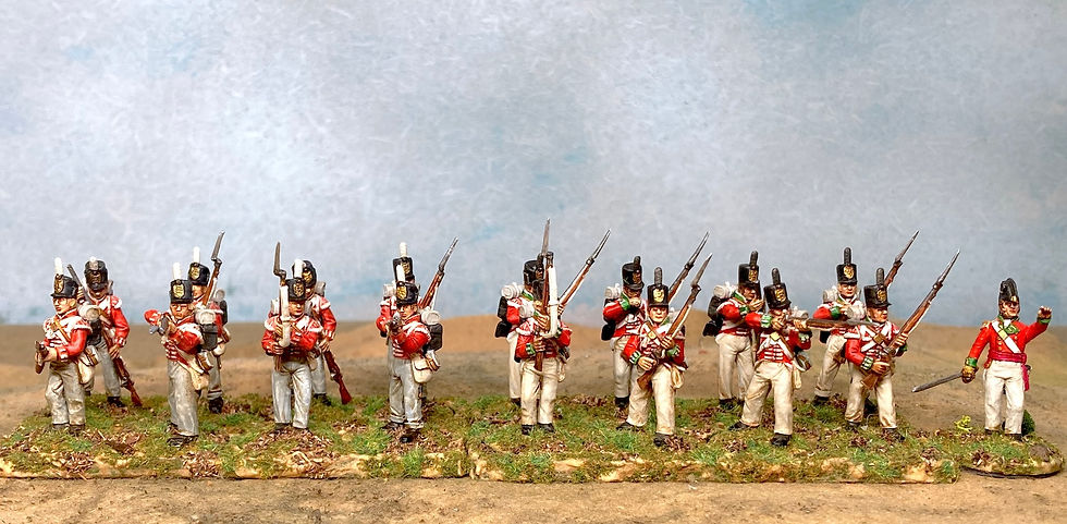Also just off the painting table is the Light Company of the 41st. These are Victrix British Waterloo Flank Company with Perry heads. Victrix and Perry bits and pieces fit well together. As I had Victrix Waterloo figures I needed the earlier Perry stovepipe shakos for them to work for 1812. The Perry set does not have enough flank company arms for me to make all the grenadiers and light infantry I needed.
