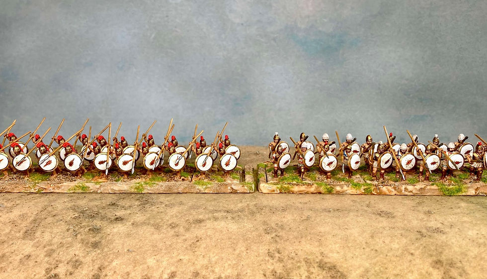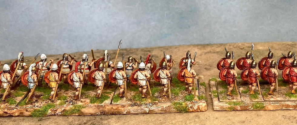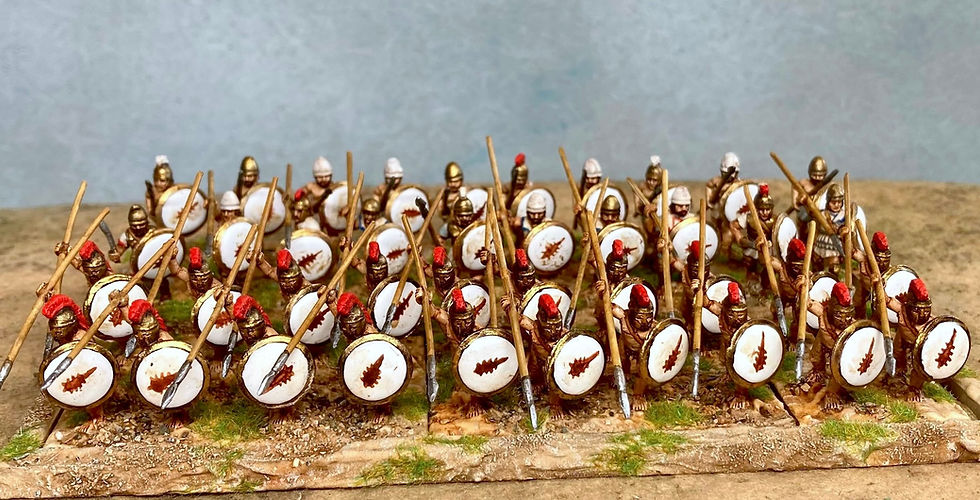 I have painted them as Thebans or other Boetians — identifiable as such by the distinctive club of Hercules shield design. At Mantinea some Thebans were also distinguished by white painted helmets.